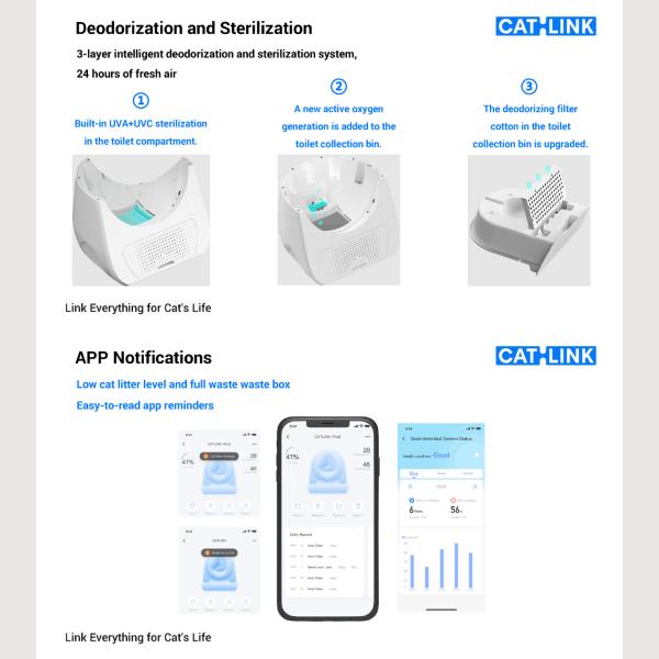 3-layer intelligent deodorization and sterilization system, 24 hours of fresh air, Built-in UVA+UVC sterilization in the toilet compartment. A new active oxygen generation is added to the toilet collection bin. The deodorizing filter cotton in the toilet collection bin is upgraded.