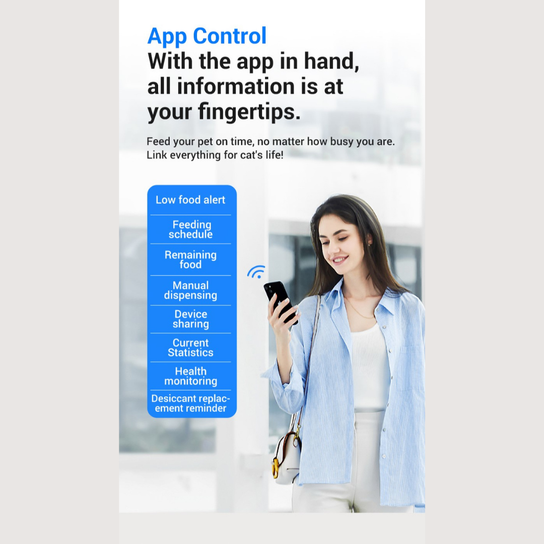 The 4L cat automatic feeder will ensure a cat is fed healthily for 20 days when filled with dry food. Program up to 20 meals to feed on your pet's schedule, 1-20 portions per meal to maintain a healthy feeding. When there is a shortage of food, a notification will be sent to you. You don't have to worry about your cat anymore when going on a short trip.